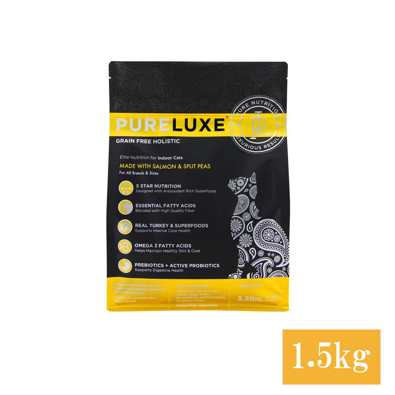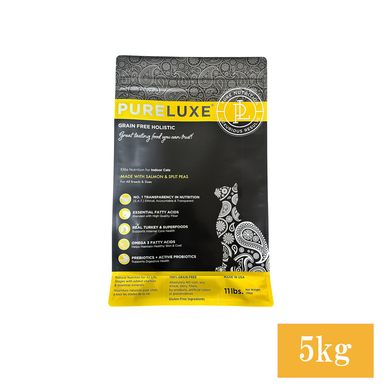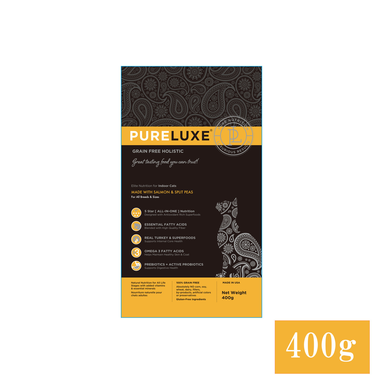 骨抜きターキー、乾燥チキン、エンドウ豆、ヒヨコ豆、チキン脂肪(保存料として混合トコフェロール使用)、卵、骨抜きサーモン、乾燥サーモン、トマトポマース、亜麻の種、天然香味料、クランベリー、サーモンオイル、チコリ根、昆布、塩、塩化コリン、ビタミン類(ビタミン E サプリメント、ナイアシンサプリメント、D-パントテン酸カルシウム、ビタミン A 酢酸塩、チアミン硝酸塩、塩酸ピリドキシン、リボフラビンサプリメント、ビタミン D₃サプリメント、ビオチン、ビタミンB₁₂サプリメント、葉酸)、カボチャの種、ユッカシジゲラ抽出物、塩化カルシウム、ミネラル類(硫酸第一鉄、酸化亜鉛、炭酸カルシウム、酸化マンガン、硫酸銅、アミノ酸キレート化鉄、アミノ酸キレート化マンガン、アミノ酸キレート化亜鉛、アミノ酸キレート化銅、亜セレン酸ナトリウム、炭酸コバルト、エチレンジアミン・ジヒドロヨウ素)、タウリン、混合トコフェロール、L-カルニチン、ターメリック、バチルス・コアグランス発酵生成物、ローズマリー抽出物