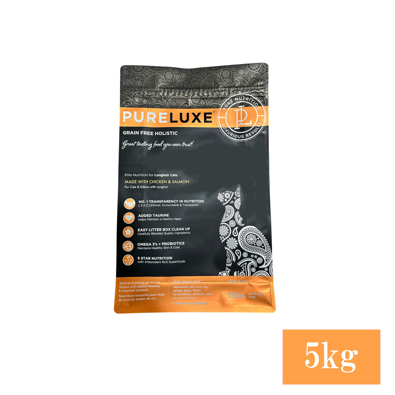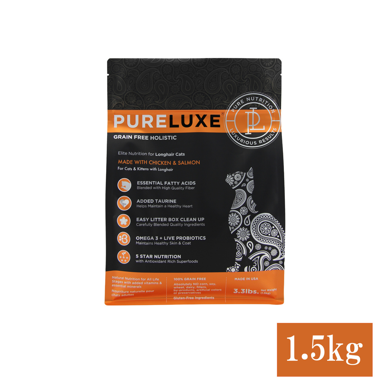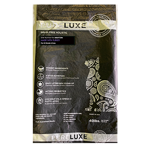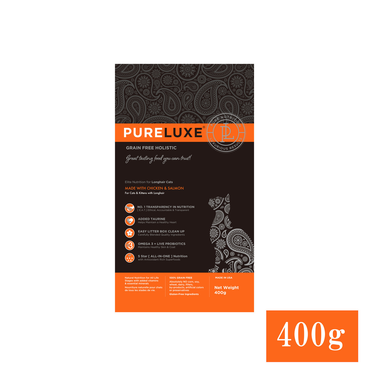 骨抜きチキン、乾燥チキン、ヒヨコ豆、エンドウ豆、チキン脂肪(保存料として混合トコフェロール使用)、卵、乾燥サーモン、骨抜きサーモン、亜麻の種、天然香味料、トマトポマース、クランベリー、サーモンオイル、昆布、塩、チコリ根、塩化コリン、ビタミン類(ビタミン E サプリメント、ナイアシンサプリメント、D-パントテン酸カルシウム、ビタミン A 酢酸塩、チアミン硝酸塩、塩酸ピリドキシン、リボフラビンサプリメント、ビタミン D₃サプリメント、ビオチン、ビタミンB₁₂サプリメント、葉酸)、カボチャの種、ユッカシジゲラ抽出物、塩化カルシウム、ミネラル類(硫酸第一鉄、酸化亜鉛、炭酸カルシウム、酸化マンガン、硫酸銅、アミノ酸キレート化鉄、アミノ酸キレート化マンガン、アミノ酸キレート化亜鉛、アミノ酸キレート化銅、亜セレン酸ナトリウム、炭酸コバルト、エチレンジアミン・ジヒドロヨウ素)、混合トコフェロール、タウリン、L-カルニチン、ターメリック、バチルス・コアグランス発酵生成物、ローズマリー抽出物